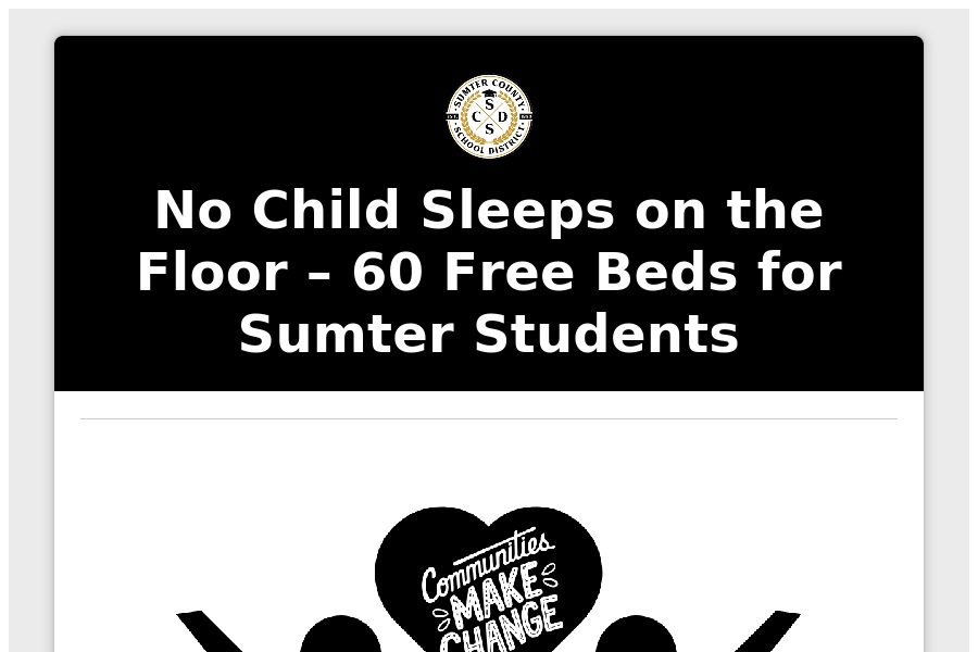 No Child Sleeps on the Floor 60 Free Beds for Sumter Students Dear Families, Were proud to share a meaningful oppo. . .